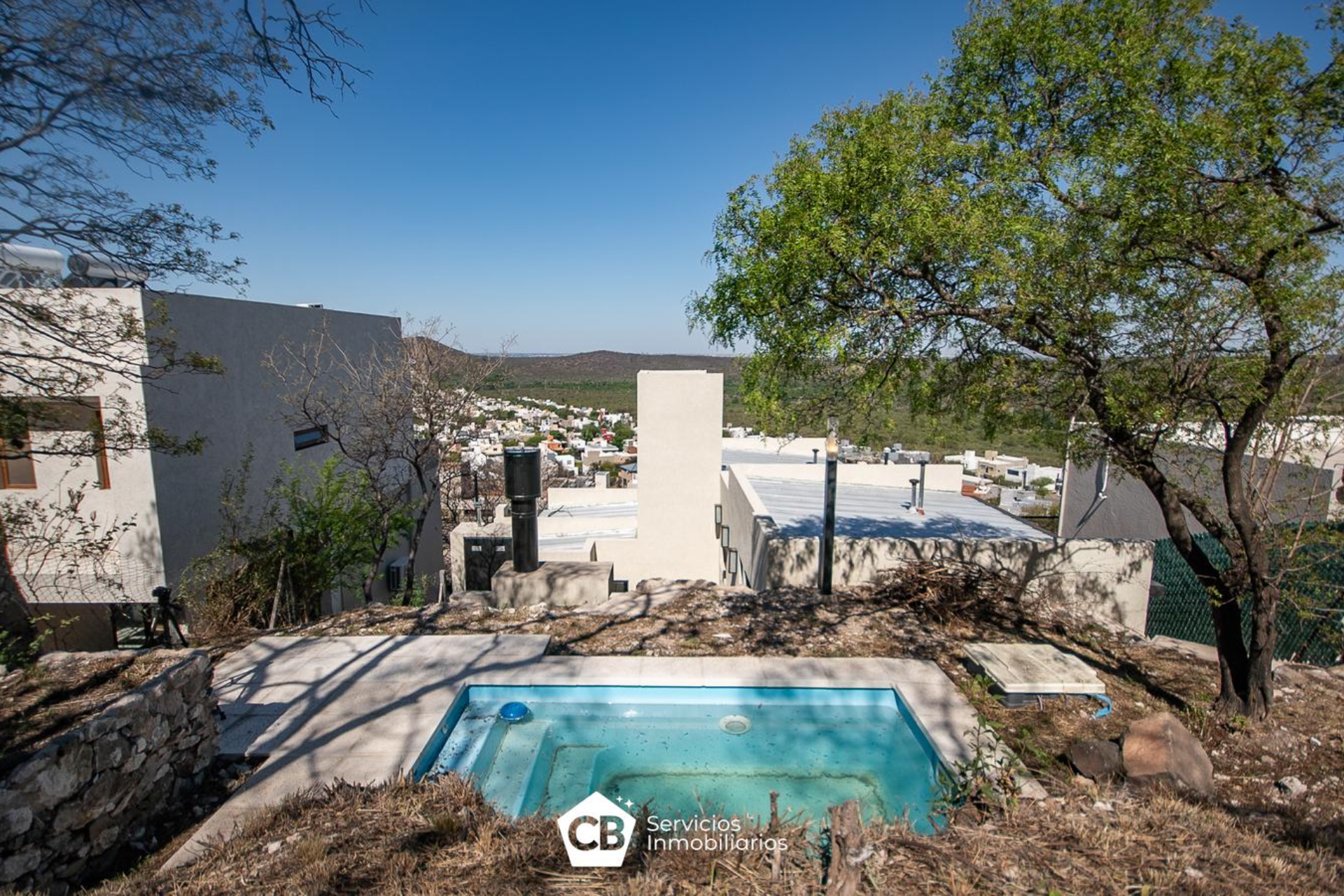 Pileta en parte alta del patio con solárium y hermosa vista a la ciudad de Córdoba.